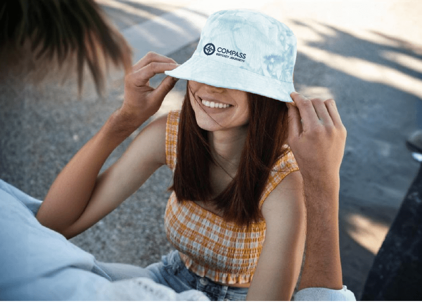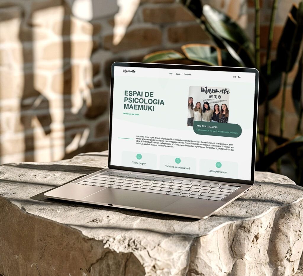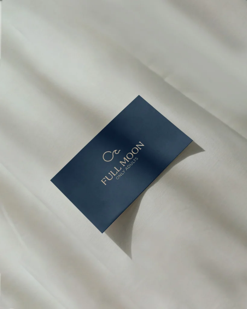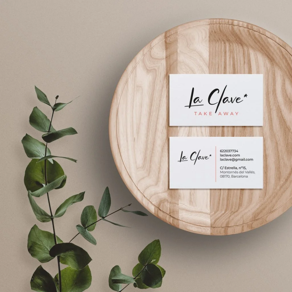 Una copa de vino blanco reposa sobre una mesa junto a un trozo de madera flotante y una tarjeta verde con un logotipo. El fondo está tenuemente iluminado y proyecta sombras sutiles.