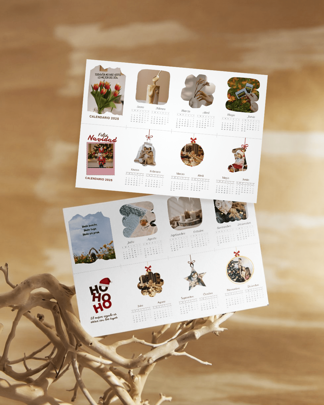 Crea tu calendario de forma súper fácil con esta plantilla editable en Canva. Puedes cambiar las fotos por las tuyas, ajustar colores o usar las imágenes incluidas para un look más neutro y elegante.