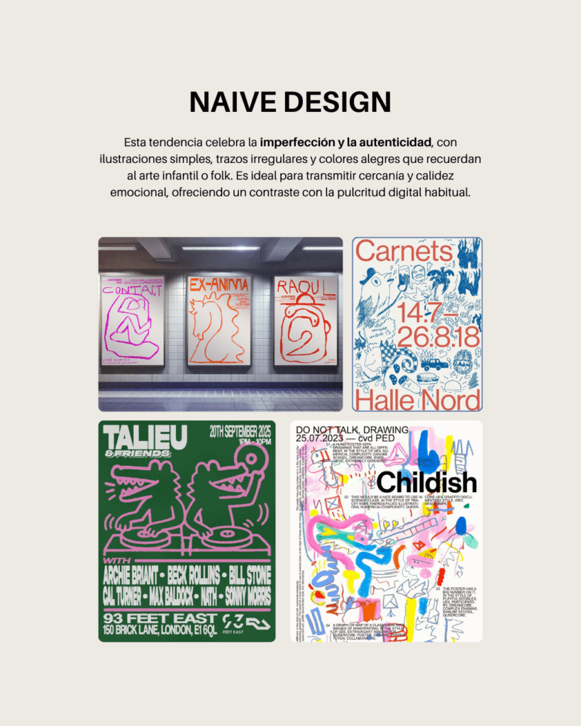 El naive design celebra lo simple, lo imperfecto y lo humano. Ilustraciones con trazos irregulares, composiciones espontáneas y colores alegres que recuerdan al arte infantil o folk.