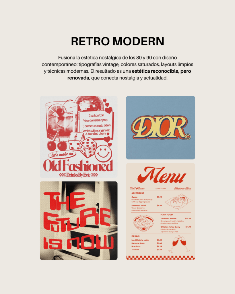 El diseño retro vuelve, pero reinterpretado. Tipografías inspiradas en los años 80 y 90, paletas saturadas y referencias nostálgicas se combinan con layouts limpios y técnicas contemporáneas.