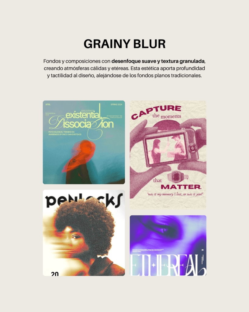 Fondos desenfocados, texturas granuladas y composiciones suaves aportan una sensación más táctil y envolvente. Frente a los fondos planos, esta tendencia busca crear atmósferas que invitan a detenerse y mirar.