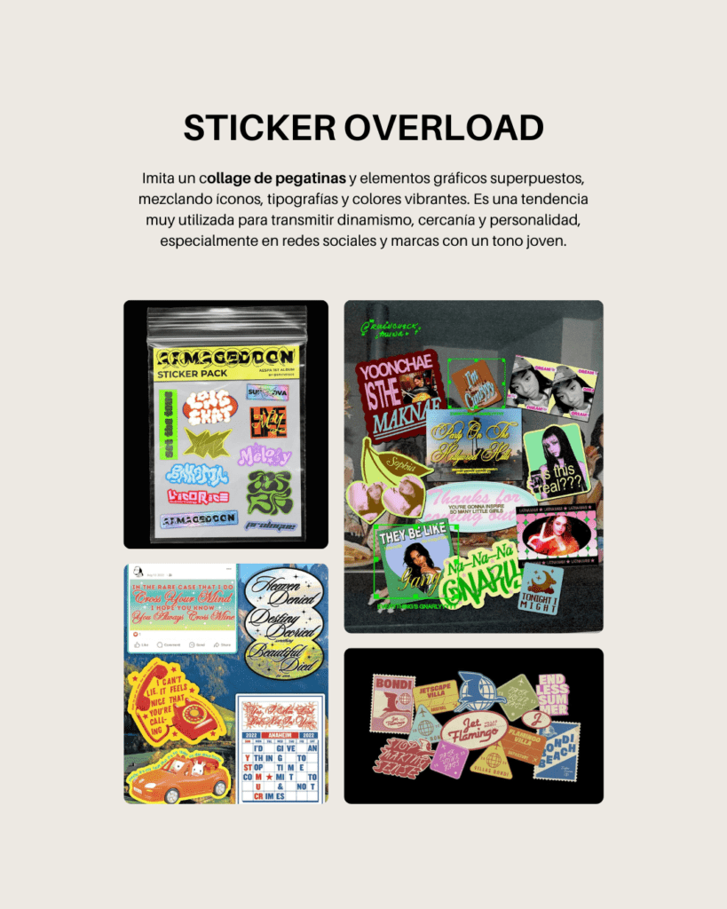 Collages de pegatinas, superposición de elementos, tipografías variadas y colores vibrantes. El sticker overload transmite dinamismo, cercanía y un tono desenfadado.
